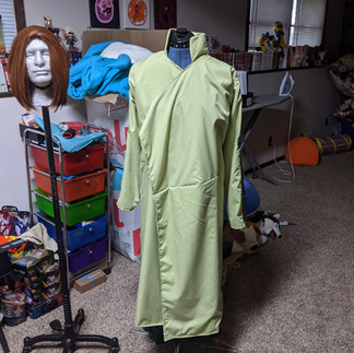 Kimono top: Made from light green cotton, hand patterned. The collar has stabilizer in it to hopefully keep it up. I also satin stitched a dark green cotton on the sleeves, and attached two 4mm foam coins with the Chinese characters for courage and bravery on them. They were both painted the same way as the head piece and sealed with mod podge. The top has two sets of hook and eye closures on the top to ensure no slippage. The top has a top stitch hem all the way around the top, save for the collar.